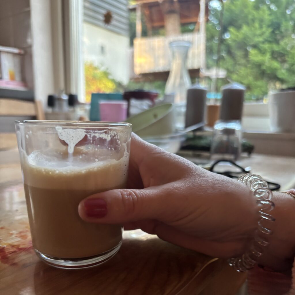 Die Jungs sind in der Schule, der Mann ist beim Sport, heute steht unser letztes MomCo Treffen 2025 an! Ich wasche meine Haare, ziehe das Mädchen und mich an, wir frühstücken und fahren zur Kirche. Wir haben ein wunderbares, gemütliches, ehrliches Treffen, essen echten Baumkuchen und sprechen über Weihnachts-Traditionen. Mein Wunsch ist es, als Mama und Hausfrau die Weihnachtstage nicht automatisch als stressigste Zeit des Jahres zu sehen. Wir sprechen über das allererste Weihnachten und ich verteile eine kleine Anleitung zum Entspannen.