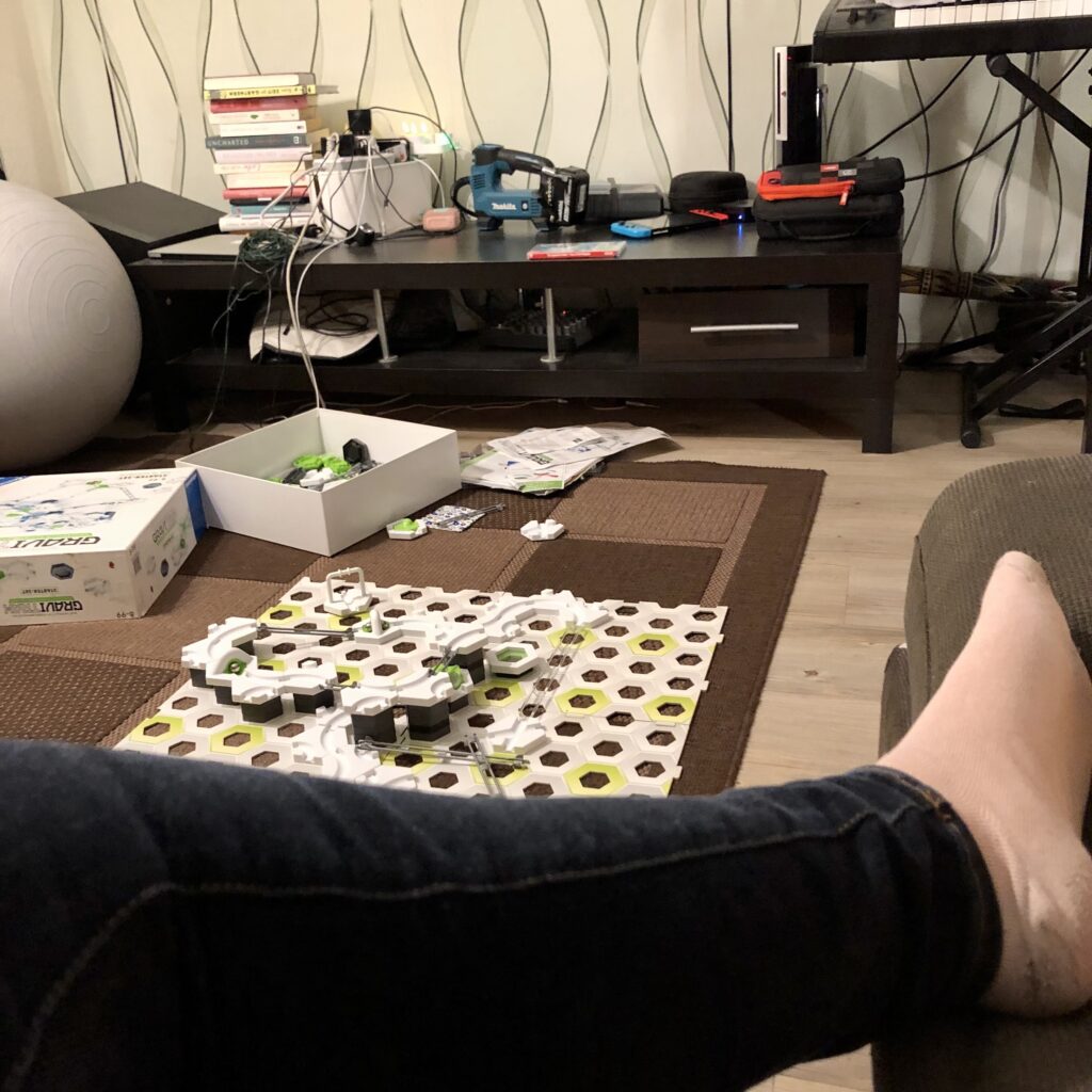 Der Mann bringt den Kleinen um 16:20 Uhr zu den Pfadfindern und bleibt eine Weile da. Der Große geht zu 17 Uhr zu einem Weihnachts-Vorspiel des Bläserchors. Sie spielen jedes Jahr bei Kaufland. Danach geht er zu den Pfadfindern. Der Mittlere liegt im Bett und schläft. Die Kleine ist müde und quengelig, schläft aber nicht. Erst beschäftigt sie sich und spielt. Natürlich „baut“ sie an der Gravitrax Bahn (Werbelink) des Bruders rum und nimmt sie auseinander.