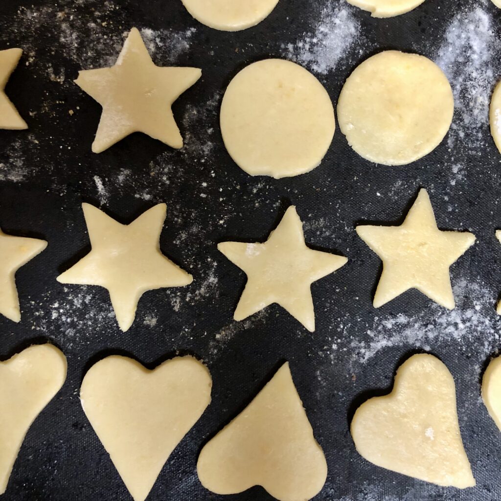 Ich hole einen Teig aus dem Kühlschrank, den ich vor einigen Tagen gemacht habe. In der Küche setze ich das Mädchen in ihren Hochstuhl und sie darf mit den Ausstechformen spielen. Die beiden Jungs schauen einen Film und ich steche ein paar Kekse aus. Das geht schnell und gut. Sie kostet natürlich das Mehl und den Teig und ist ganz fasziniert von allem.. aber ich „arbeite“ alleine, also werde ich schnell fertig. Es ist spät, aber es ist Freitag und der Rhythmus ist heute sowieso anders. Auch mit der Bildschirm-Zeit und dem Fertig-Essen komme ich heute klar. Ich war in der letzten Woche etwas erkältet, vielleicht haben es jetzt die Jungs. Oder die Kleine auch. Oder sie kriegt mal wieder Zähne. Ich entscheide, welche Kämpfe ich kämpfe.. wir hatten wertvolle Familienzeiten in dieser Woche und am Freitag Abend lassen wir einfach locker.