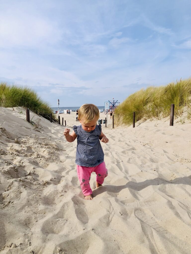 Ich habe immer mal wieder den Wetterbericht und die Bahnverbindungen in Richtung Ostsee beobachtet und konnte mein Meer-Weh nicht unterdrücken. Und so haben wir den letzten warmen Tag an der Ostsee genutzt! Um 7 Uhr sind wir hier losgefahren, waren mit die ersten in Warnemünde am Strand. Gegen 17 Uhr fielen dort die ersten Tropfen und wir haben uns wieder ins Auto gesetzt und sind nach Berlin gefahren. Das Wetter war so toll, wir waren schwimmen, haben Fischbrötchen gegessen und Steine gesammelt… und ihr ahnt es schon: Das Mädchen hatte Platz, Wasser und Sand und war glücklich. Es ist wirklich so. Sie setzt sich in den ersten Sandhaufen oder die erste Pfütze und spielt los. Mehr braucht sie nicht.
