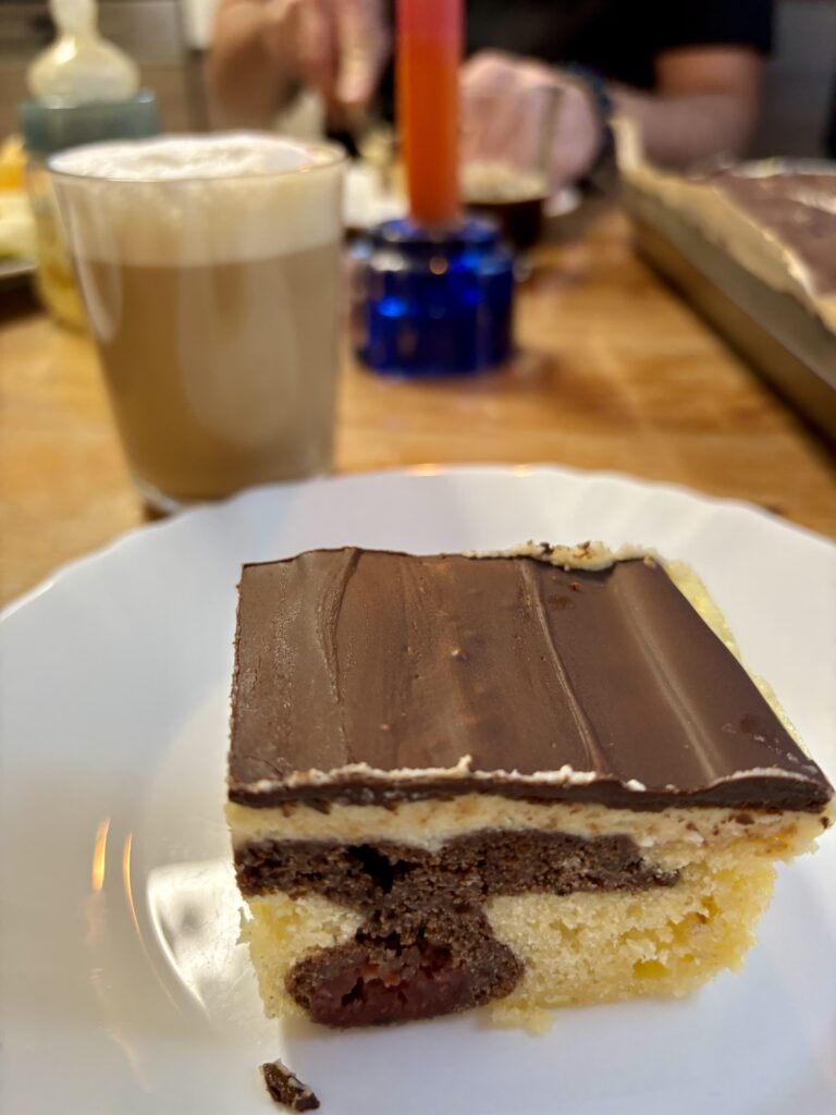 Zum Nachmittag bereitete ich einen Obstteller vor und deckte den Tisch schön mit Kerzen. Dann holte ich den großen Kuchen aus dem Kühlschrank. Jedes Jahr zumGeburtstag wünscht der Mann sich Donauwelle. In den letzten Jahren habe ich Muffins gebacken – dieses Jahr wurde es dann endlich der Blechkuchen. Ich selbst mag diesen Kuchen nicht so. Er schmeckt mir nicht besonders gut und ich finde es auch nicht ganz leicht, ihn zu backen. Aber dieses Mal ist er mir gelungen und hat uns allen geschmeckt.