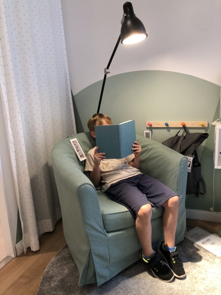 Es ist dann irgendwann 12:00 Uhr. Ich beschließe, zu IKEA zu fliehen. Der Mittlere braucht ein neues Bett und bei IKEA kann man gut Zeit verplempern. Das haben sich allerdings auch andere Familien heute gedacht… Die Kleine schläft im Auto ein und der jüngste Sohn und ich haben Zeit, uns Betten und Kinderzimmer anzuschauen. Als sie wach wird, lassen wir sie laufen und kommen nur noch sehr langsam voran. Aber es ist lustig, wie sie durch die Zimmer tippelt und Kontakt zu anderen Menschen aufnimmt.