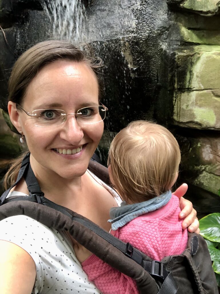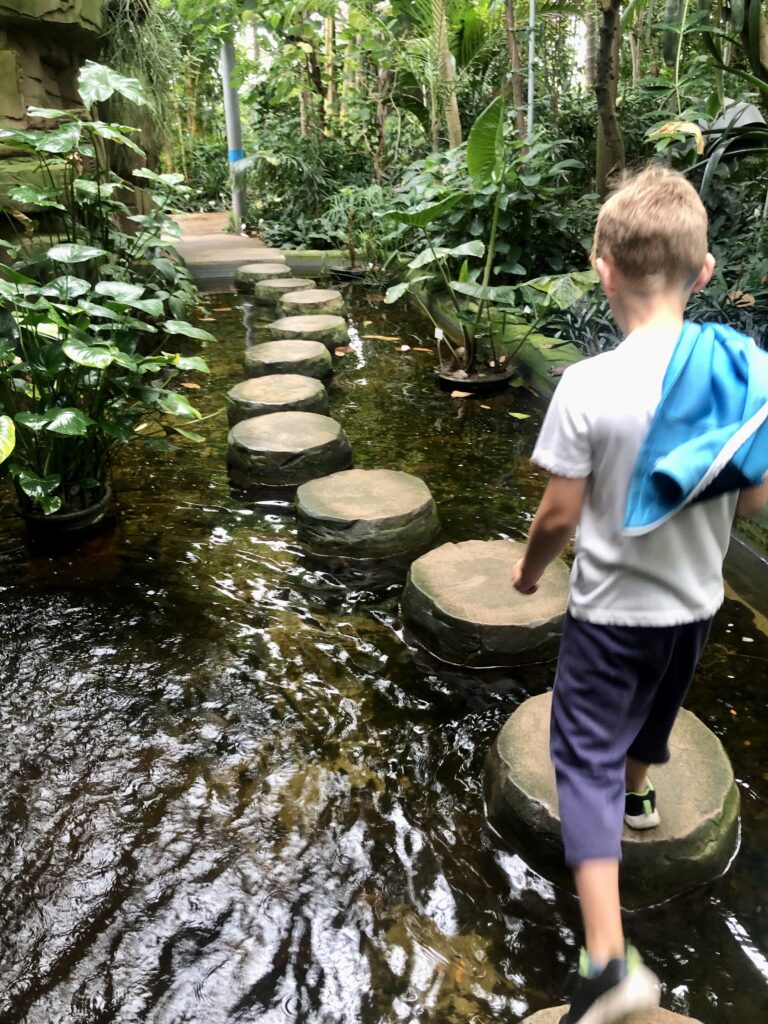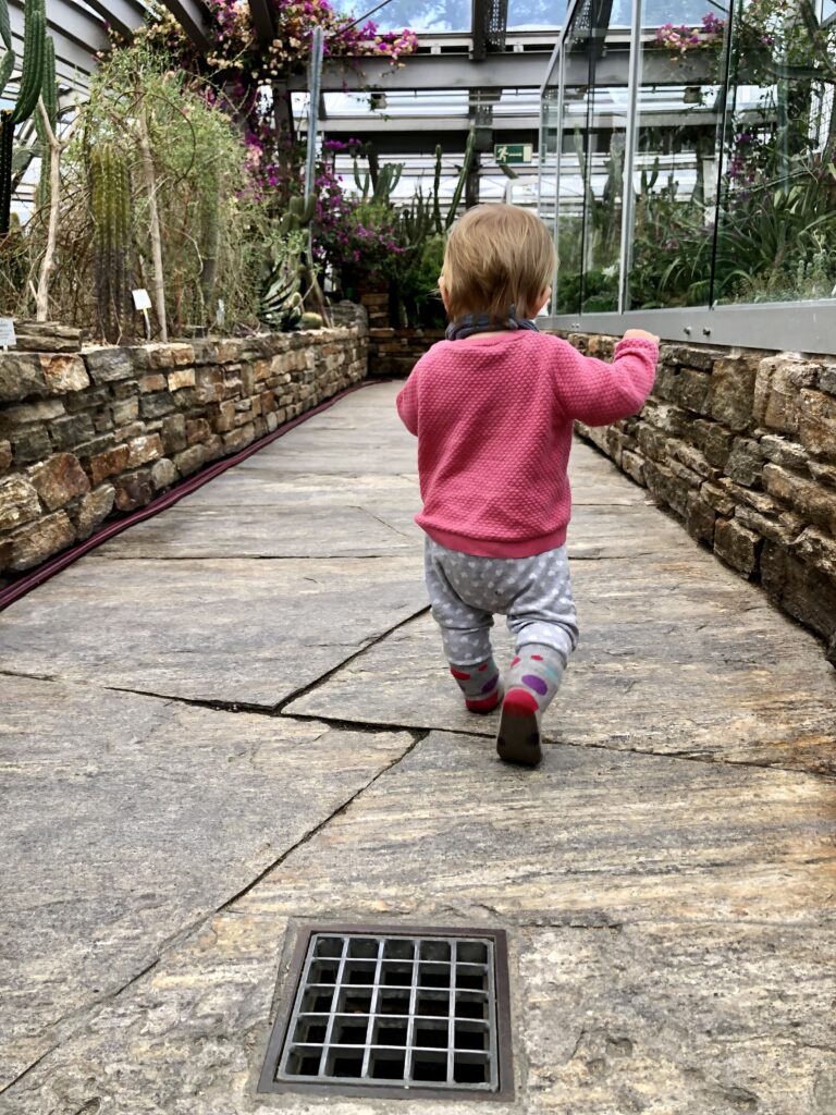 Ich setze mir das Baby in die Trage und wir laufen zu den Gewächshäusern. Dort darf sie flitzen und sie genießt die Freiheit – und den Hall in den großen Häusern, wenn sie quietscht. Wir schauen uns viele wunderschöne Pflanzen und Blüten an. Die tropische Luft ist eine kleine Herausforderung. Wir finden Schließfächer und sind so glücklich, dass wir unsere Jacken und Rucksäcke nicht mehr tragen müssen. Wir sind fast die einzigen Besucher in allen Häusern. Dann kommt der Sohn auf die Idee, die Pflanzen-Schilder durchzulesen und auf Schimpfwort-Tauglichkeit zu testen. Das wird sehr lustig!